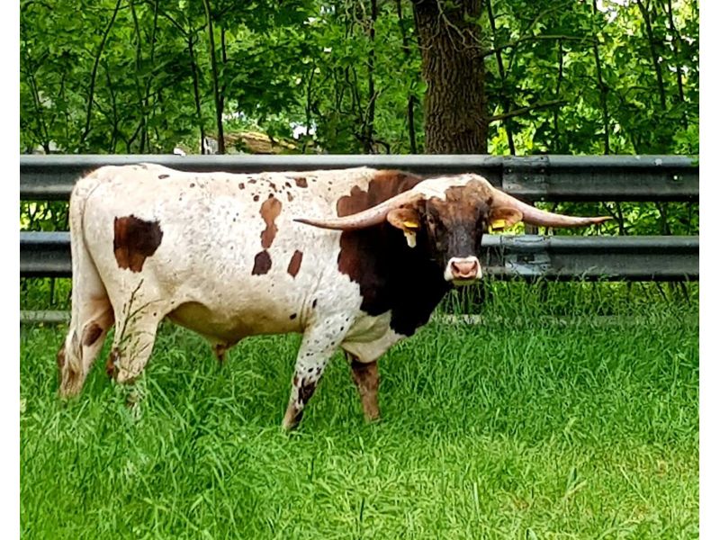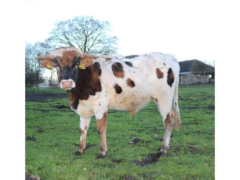 Mr Rusty Iron zelf is een sterk bevleesde stier met prachtige kleuren. Hij heeft Brindle, is Spotted en heeft Roan. Dus strepen, vlekjes en spikkels. Mooi driekleurig en grote hoorns voor zijn leeftijd. Met 15 maanden oud waren zijn hoorns 37 inches = 94 cm T2T.